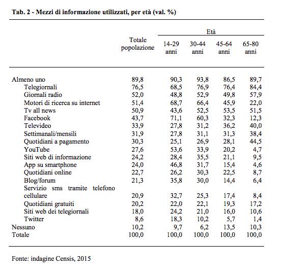 Lo ripetiamo da anni, ma in questa tabella del rapporto Censis 2015, tra le molte cose, è anche una ottima cartina di tornasole per validare il proprio media spending o la propria content strategy sui vari target. Alcuni dati, specialmente nei confronti generazionali, sono molto chiari e parlano di un paese mediaticamente diviso in due in chiave generazionale: i giovani si informano ormai online e sempre più sui social network, gli anziani rifiutano questo canale e restano aggrappati ai TG e ai quotidiani. Altri dati a mio modo di vedere rilevanti sono: – i Blog che sono fonte di informazione pe run terzo della popolazione adulta e arttiva professionalmente (30-64) -la ancora bassa penetrazione/considerazione di Twitter, che pur è molto popolare tra i cosiddetti “opinion leader” – la persistente autorevolezza dei telegiornali, che col target con cui perforammo peggio (14/29) ottengono comunque un 68,5% mentre facebook col target 65/80 non supera il 12,3% – lo stentare delle news online, che non hanno trovato una chiave di distribuzione/attrazione. Ciò che balza comunque agli occhi e che deve costituire una priorità strategica per i planner della comunicazione (siano essi “media” o “campaign manager” di un politico o strategist di un’agenzia) è che oggi i target demografici sono spaccati e consumano media diverso tra di loro quanto mai prima. Conseguentemente la scelta dei mezzi per campagne verticali o la loro differenziazione per campagne di largo respiro e la declinazione della media/content strategy, diventa un vero asset strategico.